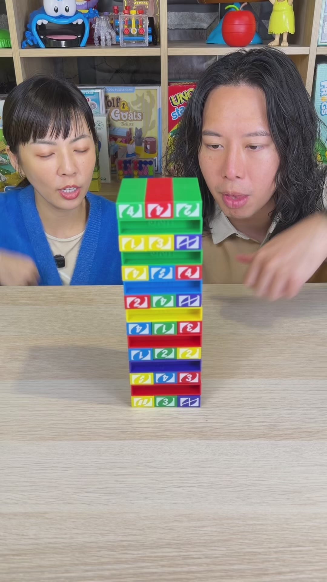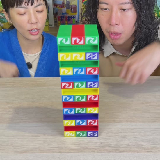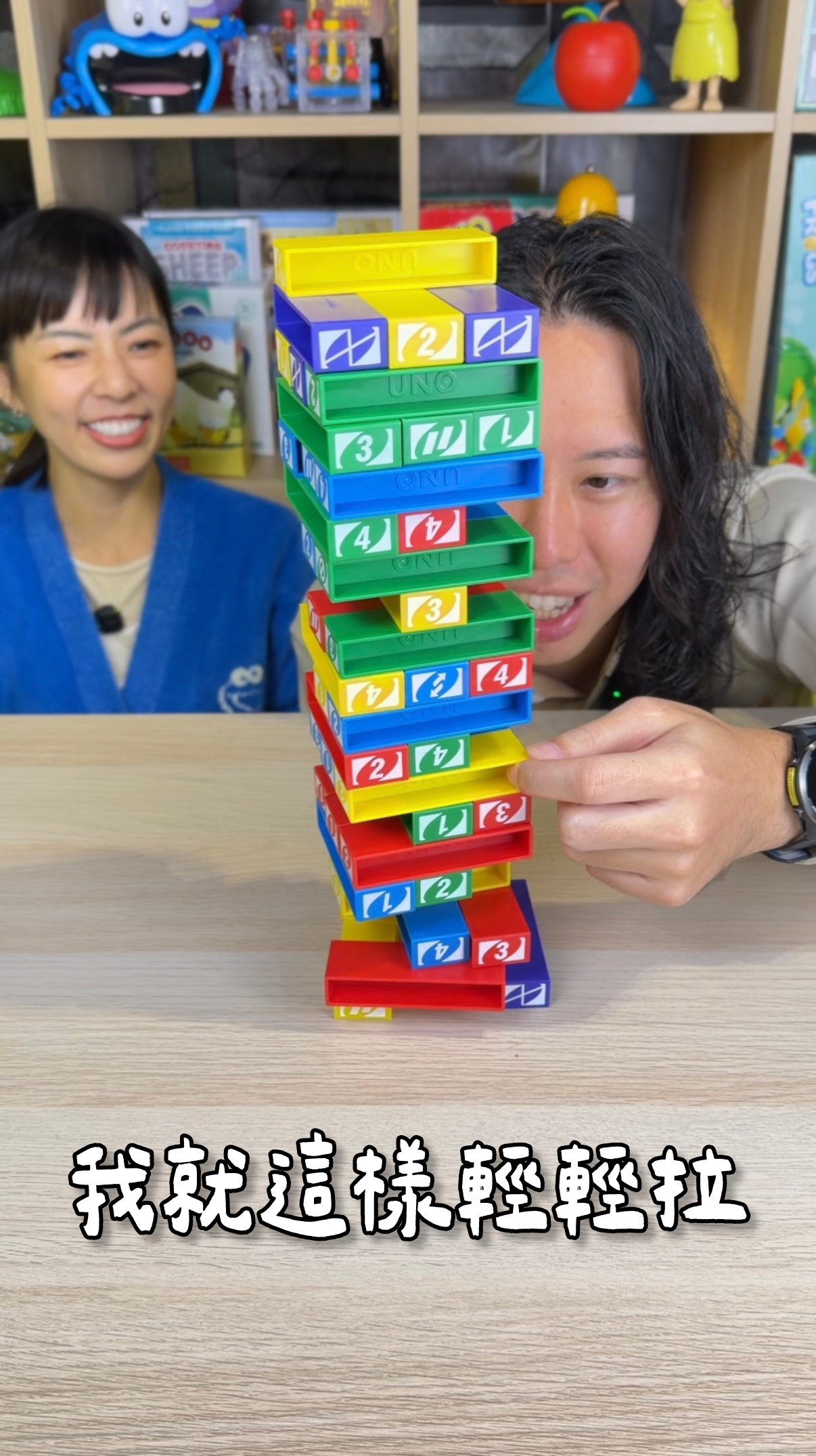 你就得乖乖抽出符合的積木,然後小心翼翼疊上去~